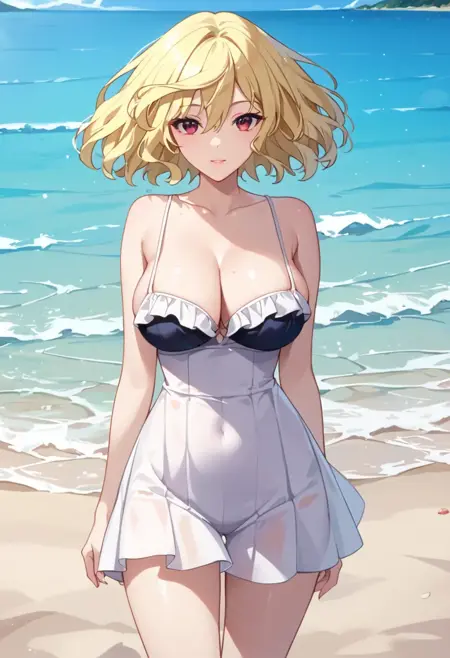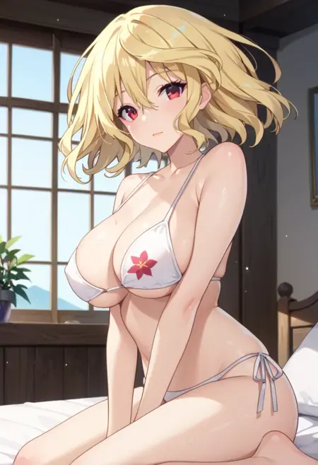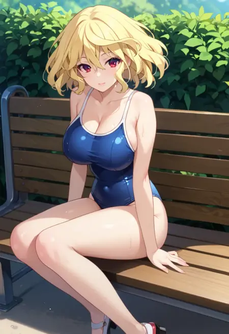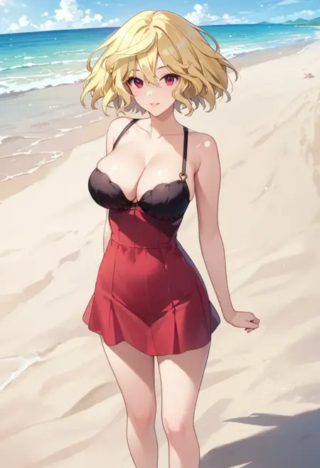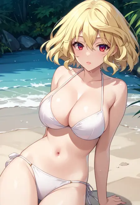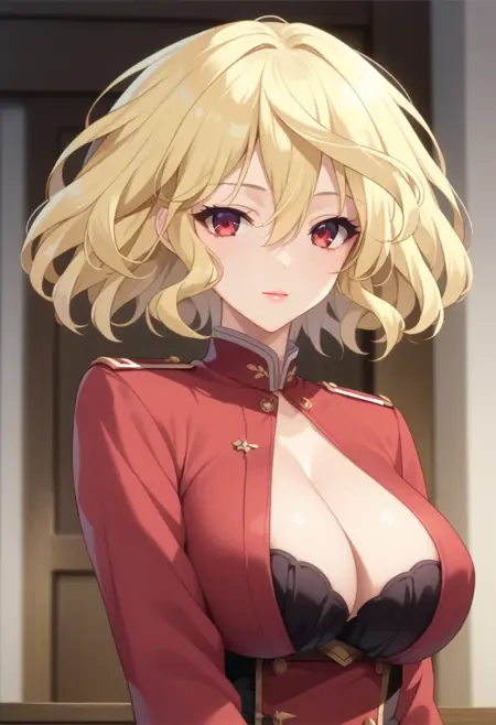 Mitsuki, blonde hair,short hair, red eyes, large breasts,