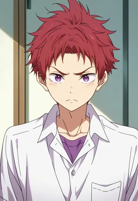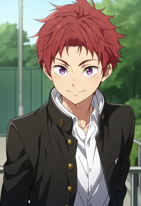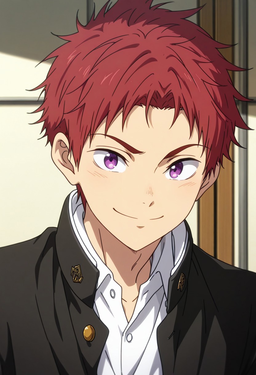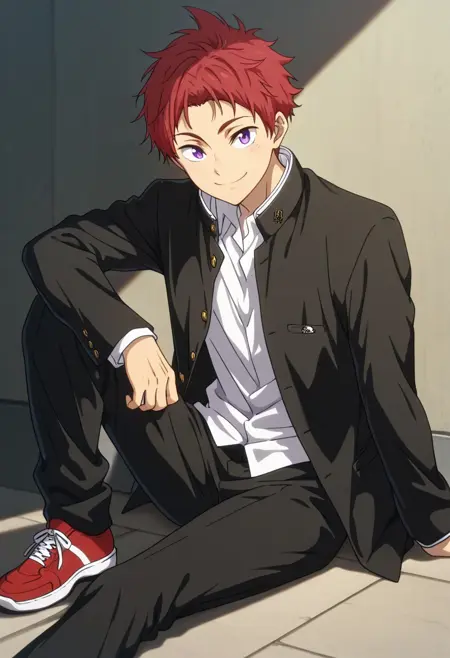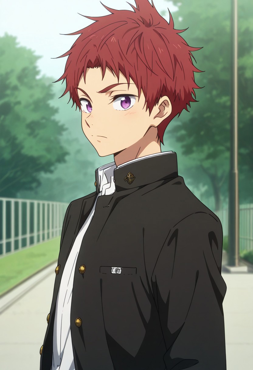 asastart, 1boy, male focus, solo, red hair, purple eyes, school uniform, gakuran, jacket, black jacket, open jacket, open clothes, shirt, white shirt, pants, black pants, shoes, sneakers, red footwear