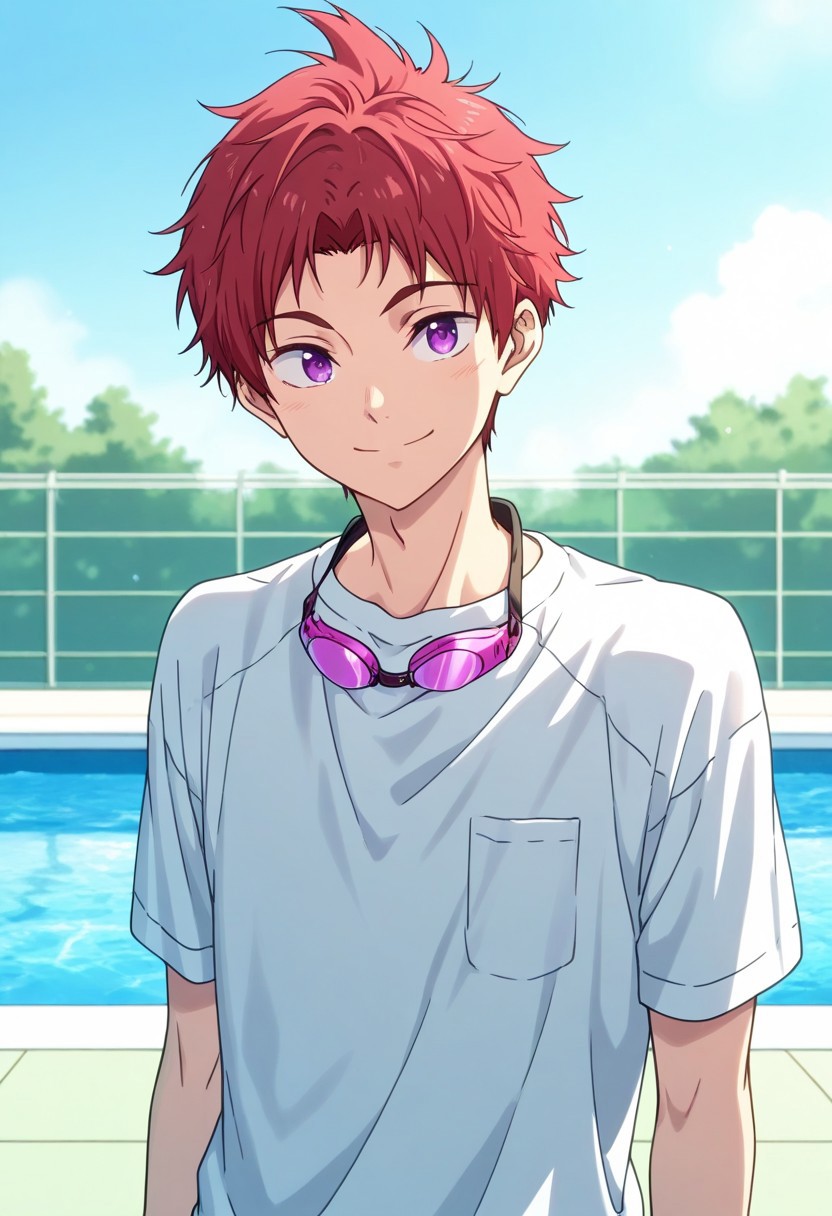 asastart, 1boy, male focus, solo, red hair, purple eyes, shirt, white shirt, t-shirt, short sleeves, goggles, googles around neck,
