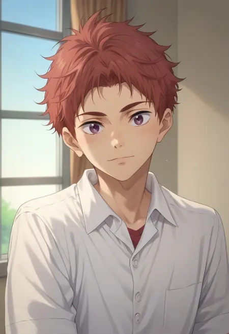 asastart, 1boy, male focus, solo, red hair, purple eyes, school uniform, gakuran, jacket, black jacket, open jacket, open clothes, shirt, white shirt, pants, black pants, shoes, sneakers, red footwear