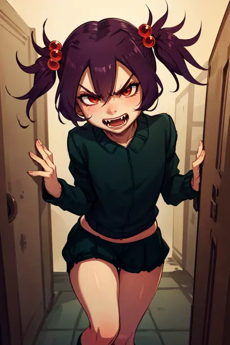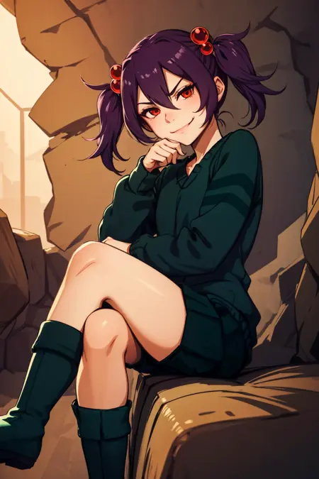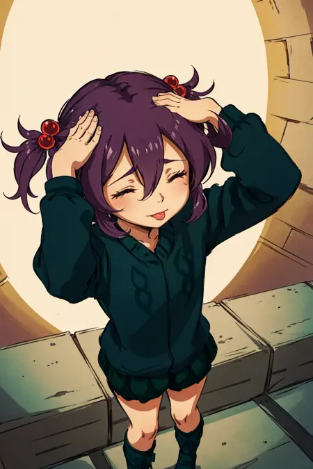 그녀의 전형적인 외모를 위해 "트윈테일, 머리끈, 녹색 스웨터, 녹색 반바지, 녹색 부츠"를 추가하세요.