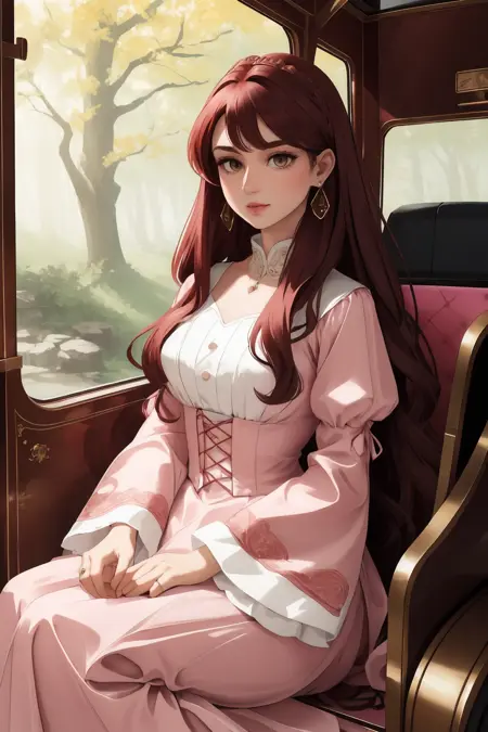 풍부한 벨벳으로 만든 화려한 드레스, 단단히 맞는 상의, 높은 허리선, 실크로 층을 이룬 넓은 치마, Maven, 평균 키, 건강한 체형, 다이아몬드형 얼굴, 밝은 피부, 연한 갈색 머리카락, 티얼색 눈, [[곡선형 코]], 두꺼운 입술, 두드러진 턱, 어깨 길이의 머리카락, 곧은 머리카락, 정식 언더 합스, 작은 가슴, 귀걸이, 오렌지색 실크 립스틱, ((장식이 최소화된 단순한 말 수레)) 안에, 정돈된 정원과 고요한 해자로 둘러싸인 웅장한 중세 저택armored_posing 예시 프롬프트:
