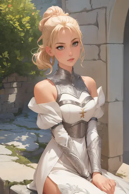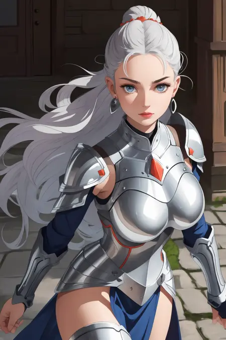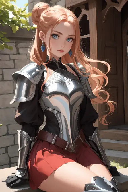 보호용 장갑, 가슴판, 다리판이 있는 갑옷, Maven, 평균 키, 건강한 체형, 다이아몬드형 얼굴, 밝은 피부, 연한 갈색 머리카락, 티얼색 눈, [[곡선형 코]], 두꺼운 입술, 두드러진 턱, 어깨 길이의 머리카락, 곧은 머리카락, 정식 언더 합스, 작은 가슴, 귀걸이, 오렌지색 실크 립스틱, 정돈된 정원과 고요한 해자로 둘러싸인 웅장한 중세 저택female_by_castles_clad_in_armor 예시 프롬프트: