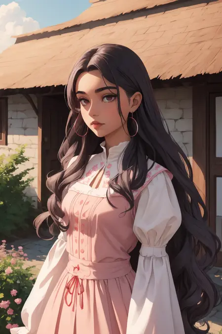 풍부한 벨벳으로 만든 화려한 드레스, 단단히 맞는 상의, 높은 허리선, 실크로 층을 이룬 넓은 치마, Maven, 평균 키, 건강한 체형, 다이아몬드형 얼굴, 밝은 피부, 연한 갈색 머리카락, 티얼색 눈, [[곡선형 코]], 두꺼운 입술, 두드러진 턱, 어깨 길이의 머리카락, 곧은 머리카락, 정식 언더 합스, 작은 가슴, 귀걸이, 오렌지색 실크 립스틱, 정돈된 정원과 고요한 해자로 둘러싸인 웅장한 중세 저택female_in_armor 예시 프롬프트: