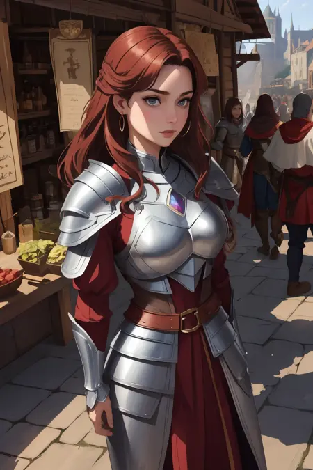 보호용 장갑, 가슴판, 다리판이 있는 갑옷, Maven, 평균 키, 건강한 체형, 다이아몬드형 얼굴, 밝은 피부, 연한 갈색 머리카락, 티얼색 눈, [[곡선형 코]], 두꺼운 입술, 두드러진 턱, 어깨 길이의 머리카락, 곧은 머리카락, 정식 언더 합스, 작은 가슴, 귀걸이, 오렌지색 실크 립스틱, 언덕 위의 요새 성채, 우아함과 매력을 더해주는 빛나는 광택female_in_horse_carriage 예시 프롬프트: