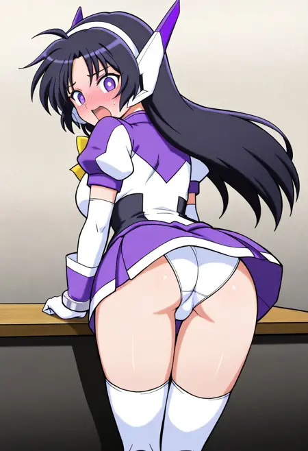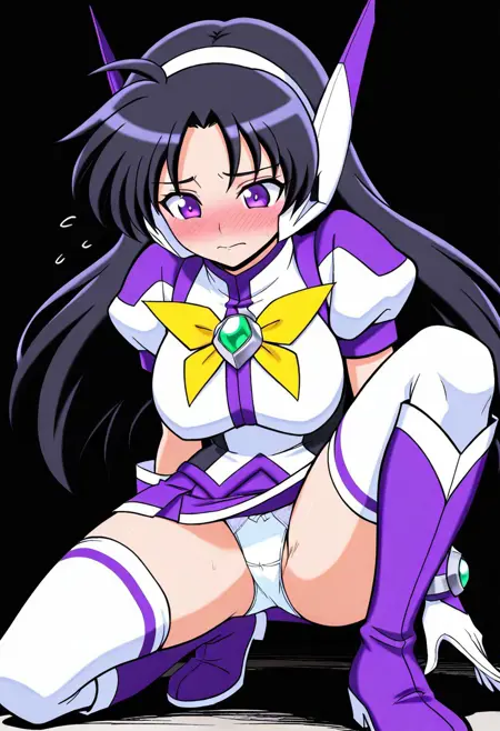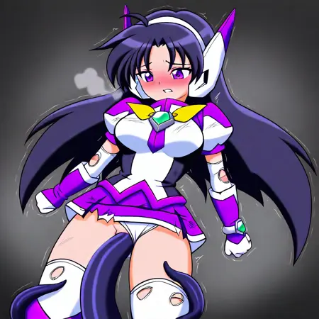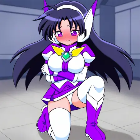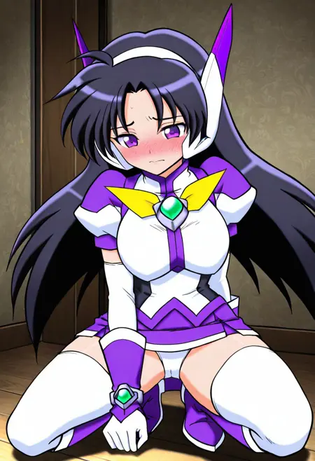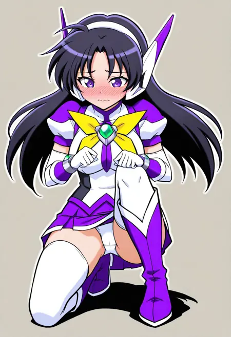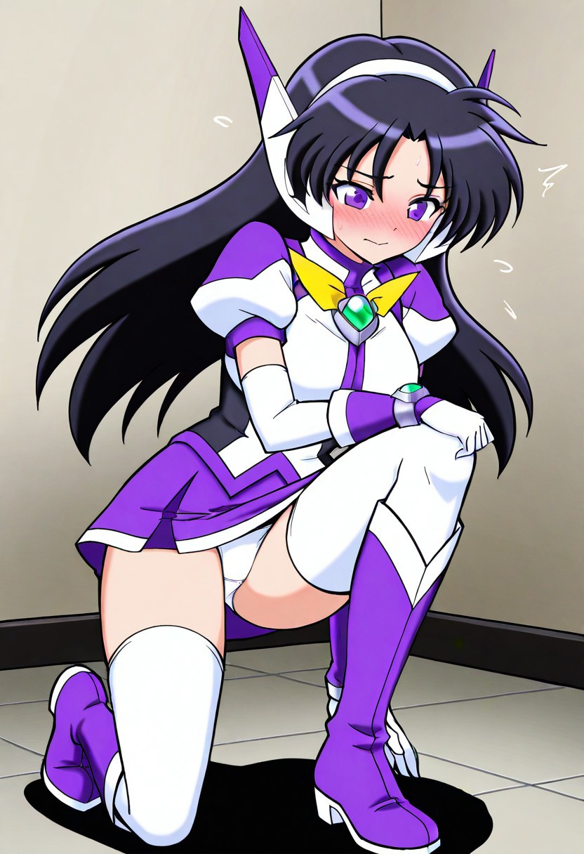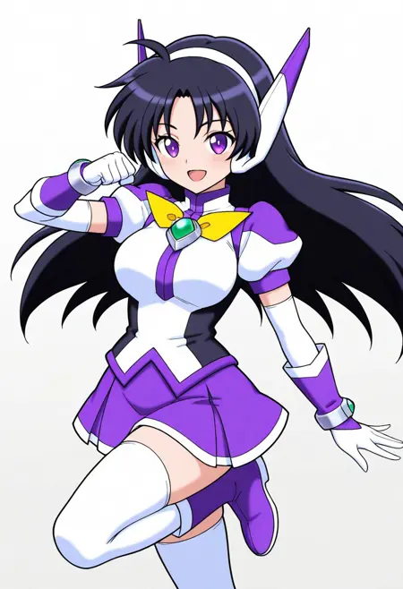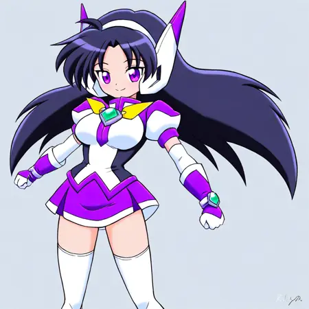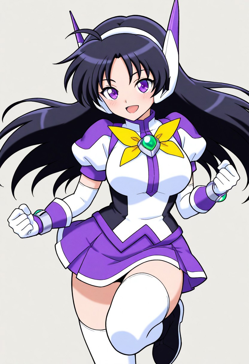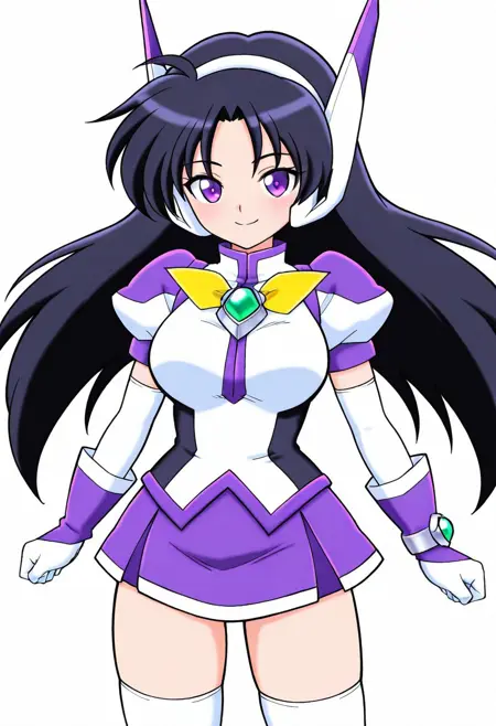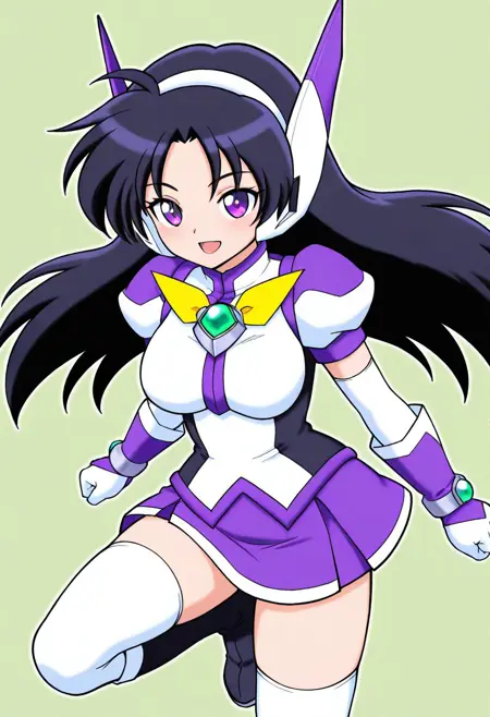 服装: purswaoutfit, 白色和紫色衬衫,立领,白色发带,白色和紫色耳机,白色和紫色手套,腕带,绿色宝石,白色镶边紫色短裙,迷你裙,白色过膝袜,绝对领域,白色和紫色长靴