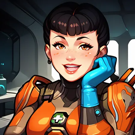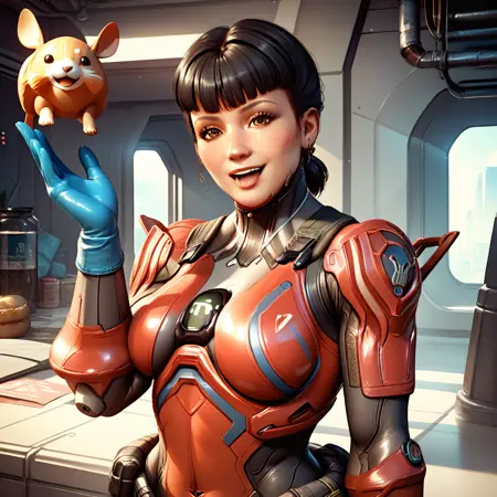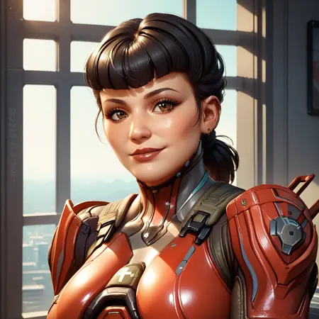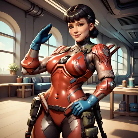 Lettie, 검은 머리, 짧은 머리, 여자, 묶은 머리, 일반적인 성숙한 얼굴, 갈색 눈, 바디수트, 빨간 갑옷, 빨간 바디수트, 바지, ((high quality face)), 사이보그, 장갑, 파란 장갑, 골반, 과학 소설