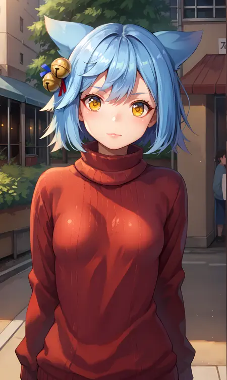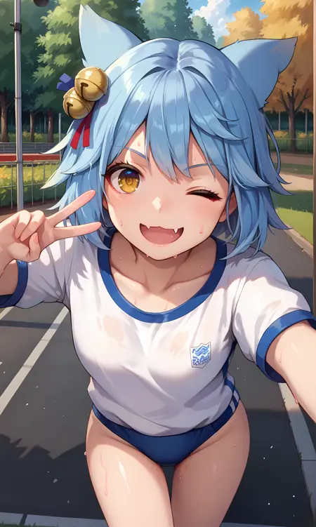 fubuki、黄色い目、青い髪、短い髪、狐の耳、髪の鈴