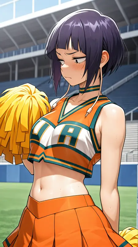 short hair, purple hair, black eyes, earlobes, earphone plugs, cheerleader outfit, orange cheerleader outfit, sleeveless, yellow pompoms, navel, orange skirt, choker, clsuit3,