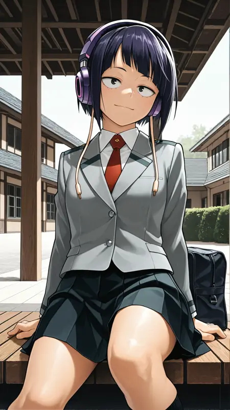 short hair, purple hair, black eyes, earlobes, earphone plugs, school uniform, grey school uniform jacket, black skirt, pleated skirt, susuit4,