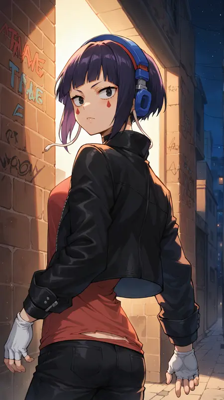 短发,紫色头发,黑眼睛,耳垂,长耳垂,耳塞插头,面部纹身,黑色项圈,蓝色耳机,皮夹克,黑色夹克,红色衬衫,撕裂的衬衫,黑色裤子,白色手套,露指手套