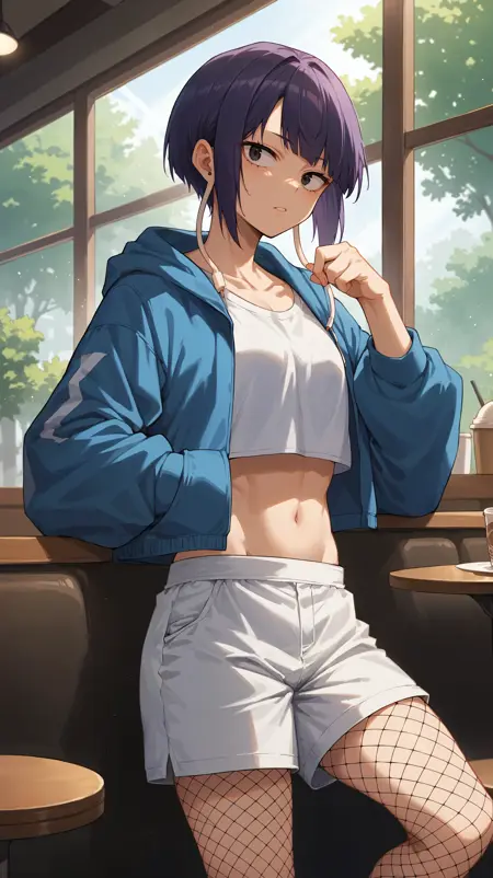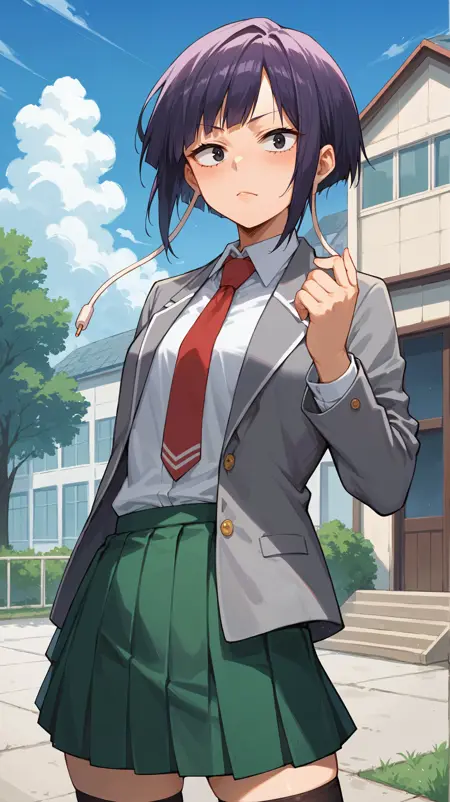 短发,紫色头发,黑眼睛,耳垂,耳塞插头,校服,灰色校服外套,黑色裙子,百褶裙,susuit4,
