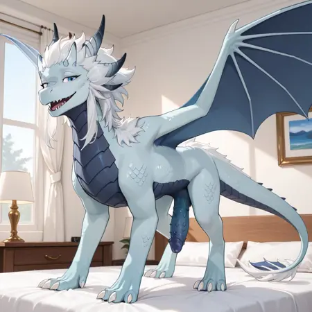 Additional prompts: dragon, light blue scales, white hair, blue wings, horns, tail, claws, blue eyes, 1boy