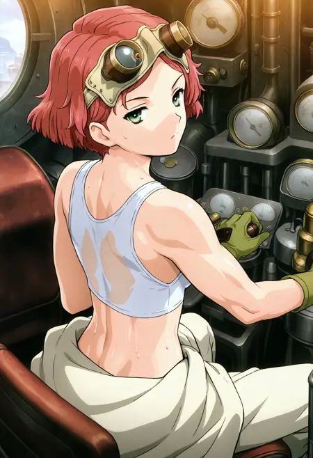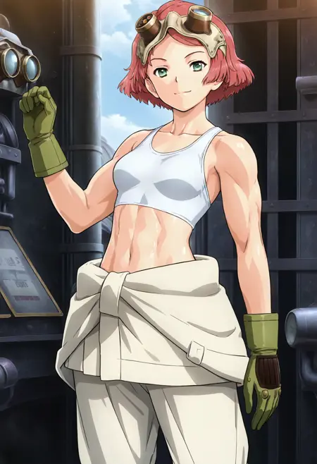 muscular female, green gloves, white tank top, clothes around waist, white pants, breasts, midriff,