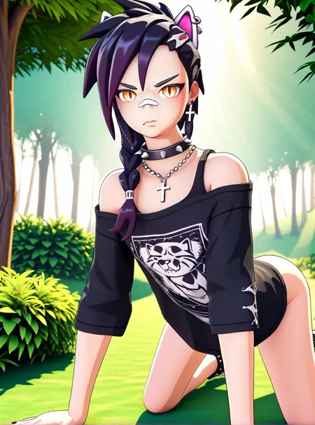<lora:erisa_fortnite:0.8>, erisa_fortnite, 1girl, long hair, black hair, yellow eyes, braid, fair skin, single braid, bandaid, braided ponytail, bandaid on nose, hair_over_shoulder, cat_ears, slit_pupils, black_outline, flat_color,