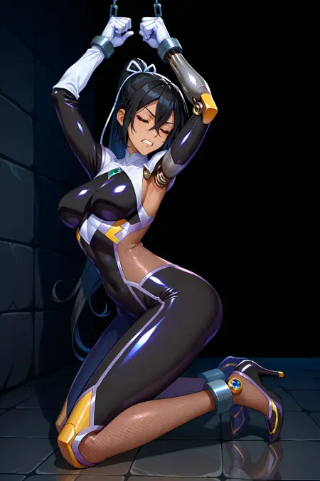 Add "hair ribbon, black bodysuit, long sleeves, white gloves, fishnets, high heels, long sleeves, skin tight" for her bodysuit.