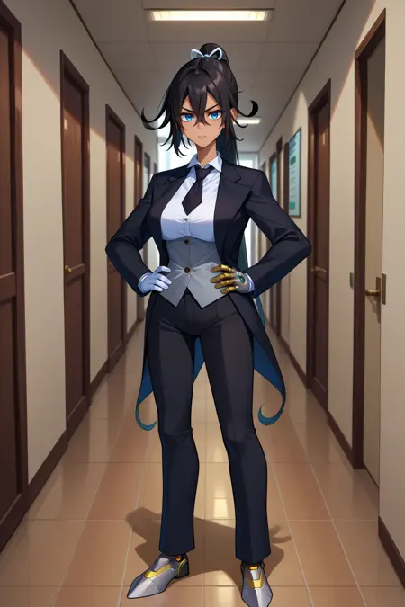 Add "hair ribbon, grey vest, black suit jacket, white shirt, collared shirt, black necktie, black pants, white gloves" for her regular look.