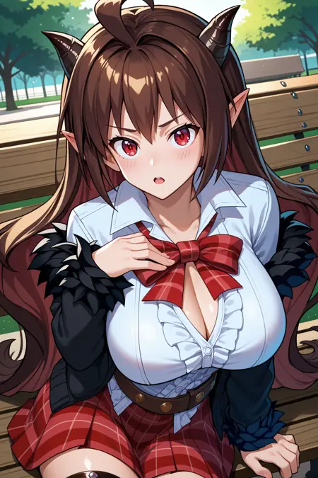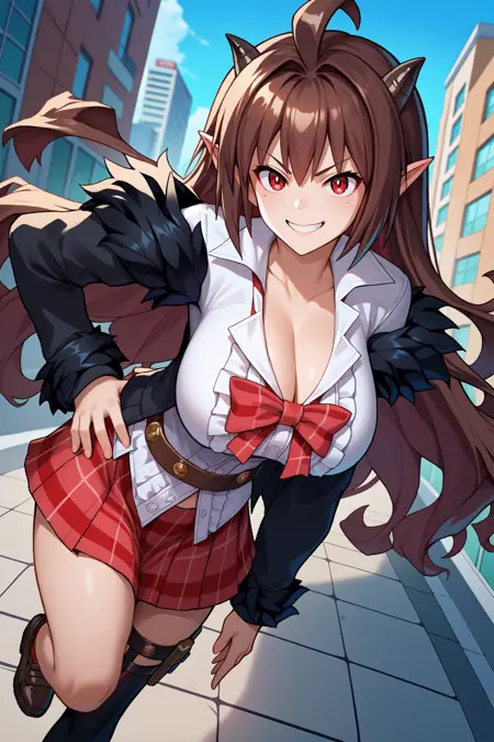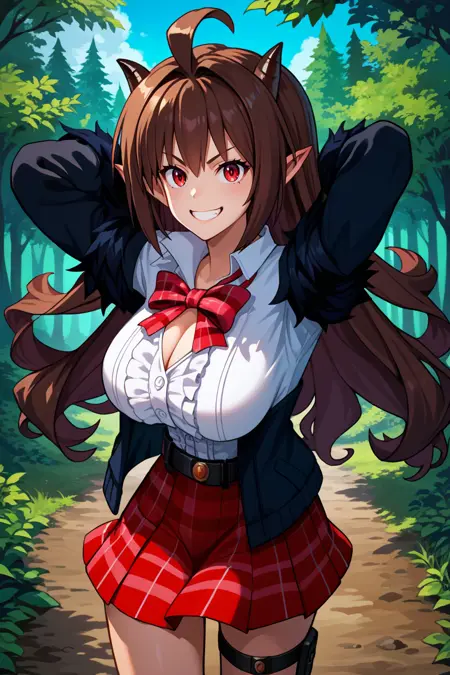 그녀의 전형적인 외모를 위해 "검은 재킷, 모직 테두리, 흰 셔츠, 칼라 셔츠, 빨간 리본넥타이, 가슴 노출, 프릴, 빨간 스커트, 체크무늬 스커트, 벨트, 허벅지 스트랩, 한쪽 허벅지 긴 양말"을 추가하세요.