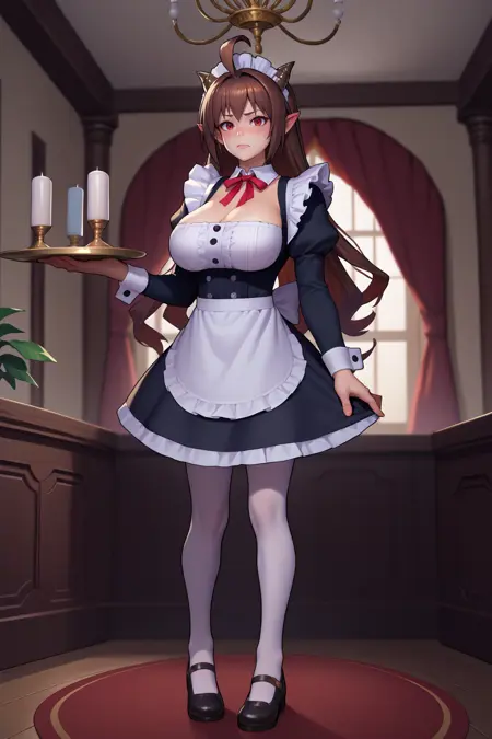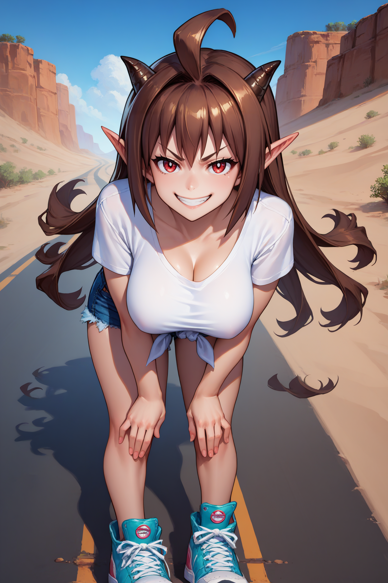 트리거 단어는 "trpglna"이며, "갈색 머리카락, ahoge, 긴 머리, 붉은 눈, 뿔, 뾰족한 귀"가 필수입니다.
