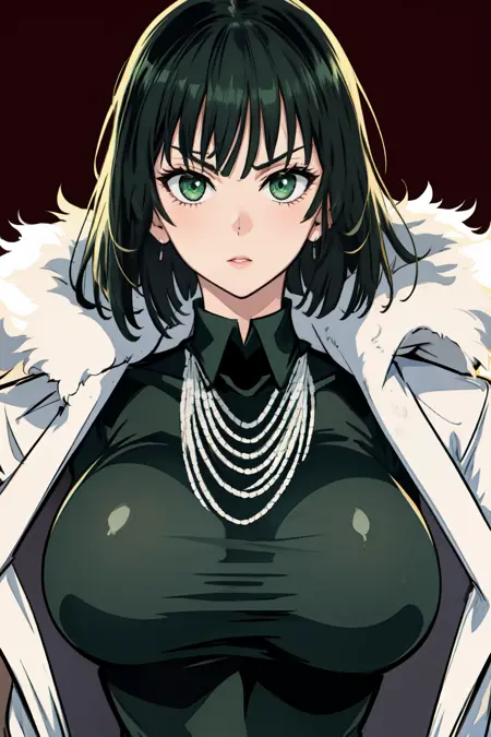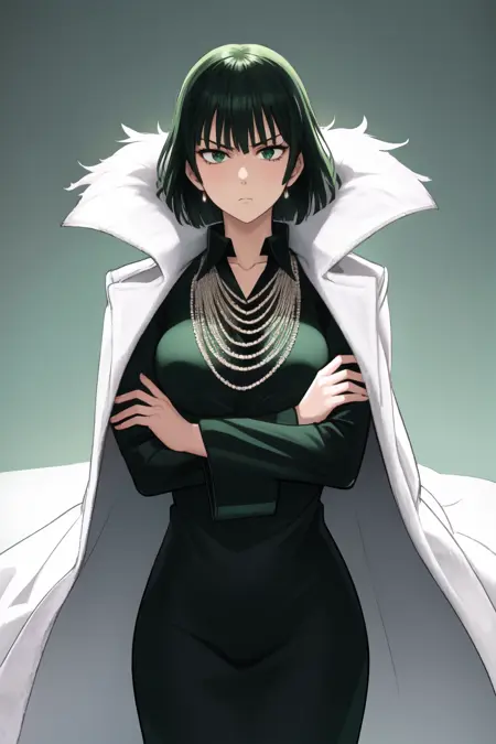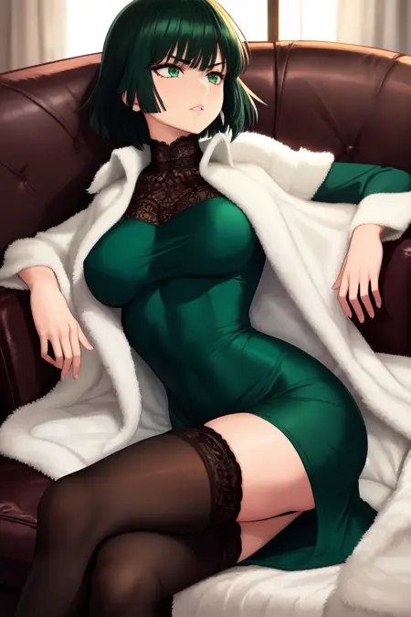 태그 제안: 녹색/검은 머리, 초록색 눈, 타이트한 드레스, 털코트, 짧은 머리