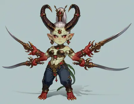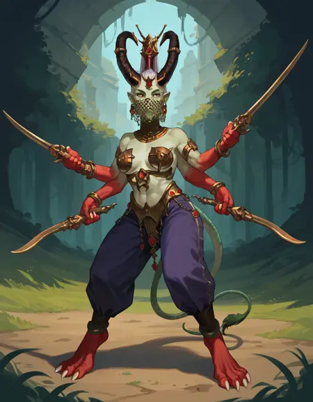 Devata, monster girl, horns, extra arms, dual wielding, green skin, jewelry,