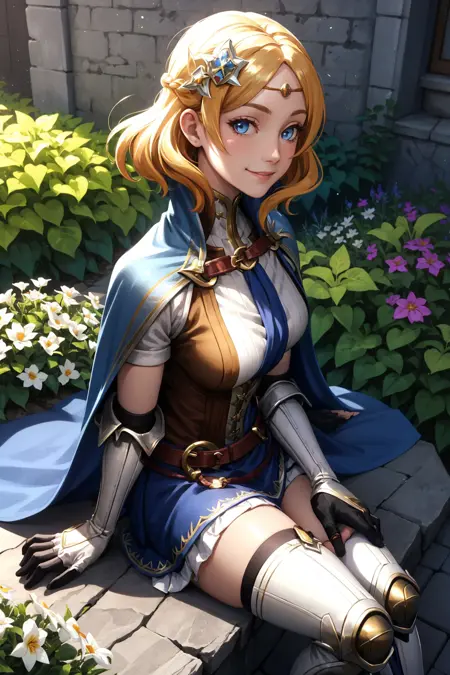 그녀의 전형적인 외모를 위해 "헤어 장식, 원형 관모, 망토, 갑옷 드레스, 팔 장갑, 파란 치마, 허벅지 부츠"를 추가하세요.