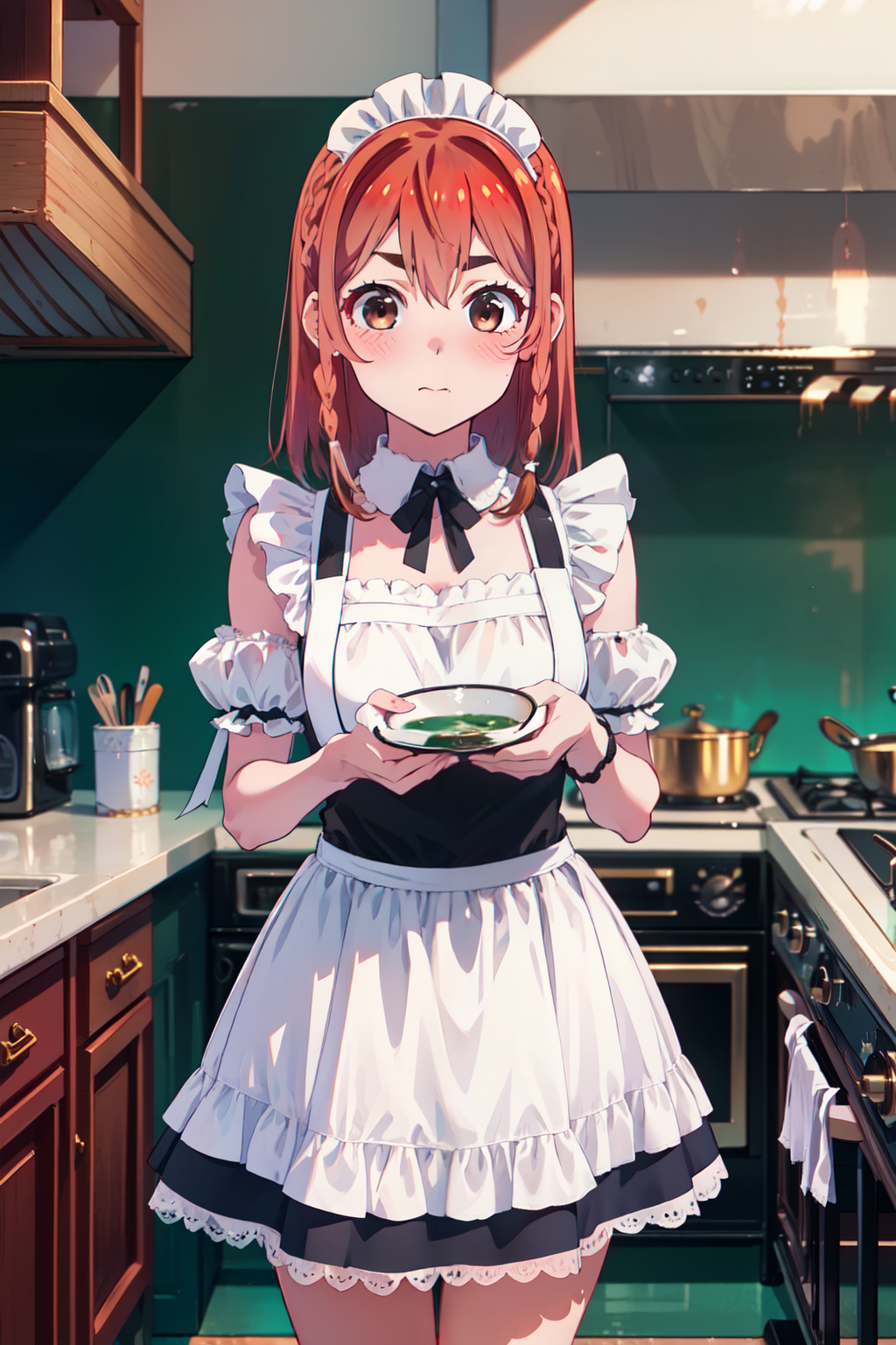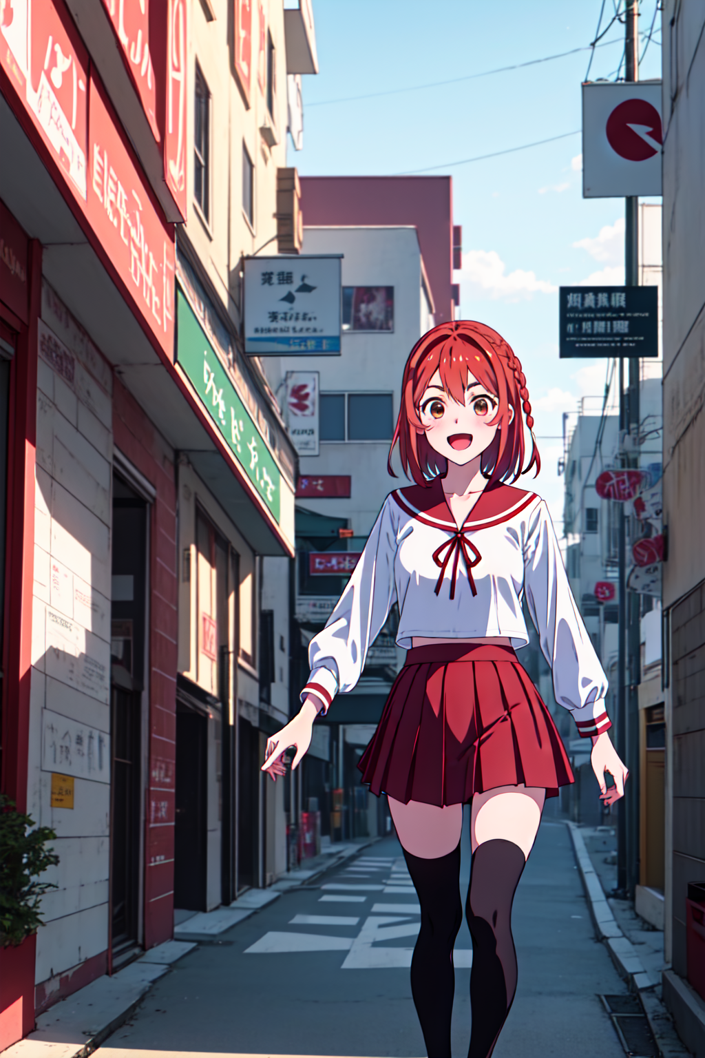 📌提示词:Sakurasawa Sumi,辫子,棕色眼睛,浅珊瑚色头发,中长发,校服,水手领,长袖,白色腿饰,过膝袜,红色领结,白衬衫,红色百褶裙,棕色乐福鞋