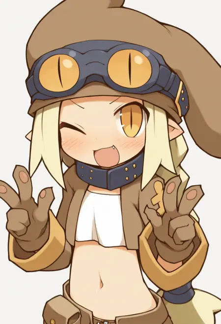 Clothes: brown gloves, gloves, goggles, goggles on head, hat, long sleeves, paw shoes, striped clothes, striped thighhighs, thighhighs, striped clothes, striped thighhighs, belt, collar