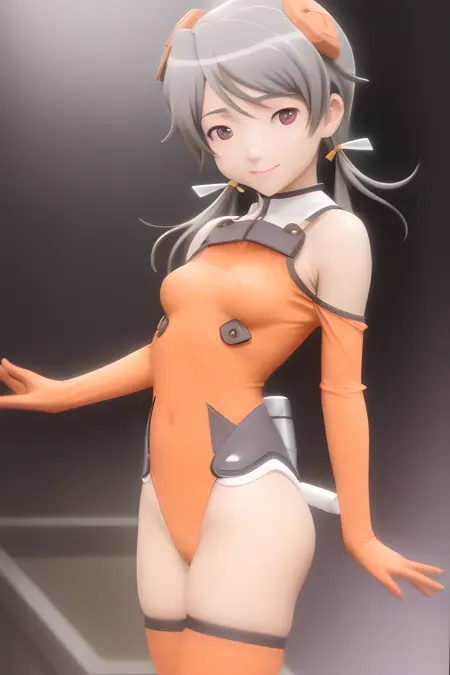要创建她的日常装扮,请使用以下提示:karen sonomiya,灰发,长发,低双马尾,发带,裸露肩膀,飞行员服,单人,肘部手套,橙色紧身衣,露颈设计,橙色过膝袜,头盔,小乳房,紫色眼睛