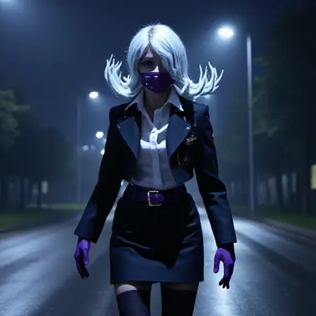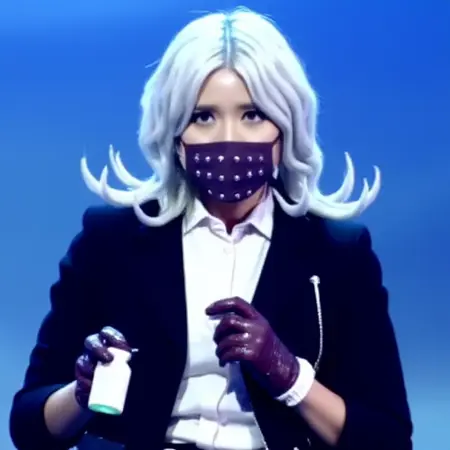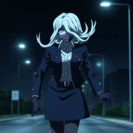 Danganronpa 3のフューチャーアークの標準衣装:木村清子はフューチャーアークの制服を着用しています。清子は小柄で、紫の瞳と不健康な肌をした女性です。髪は薄い灰色で、口を覆う呼吸器マスクを着用しています。ジャケットはダークカラーで、中央でつながった半開きのデザインです。ジャケットの lapel には小さなフューチャー財団のIDがピンで留められています。ジャケットの下は白いシャツ、ダークなミニスカート、紫色のベルト、長い黒いストッキング、紫のマリージャンズを履いています。手には紫の手袋を着用し、中央に白いストライプが1本入っています。