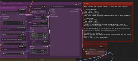 このワークフローの流れは以下の通りです:入力画像 → 「テキスト的注意マスク」(=img2noiseアンサンプラへのプロンプト入力)を追加して画像をノイズにアンサンプル(プロンプトがなくても十分に動作しますが、どの部分をノイズ化(デノイズ)したいかを指定できます)→ アンサンプラから得たノイズをサンプラーに送信し、変更された出力画像を得る。