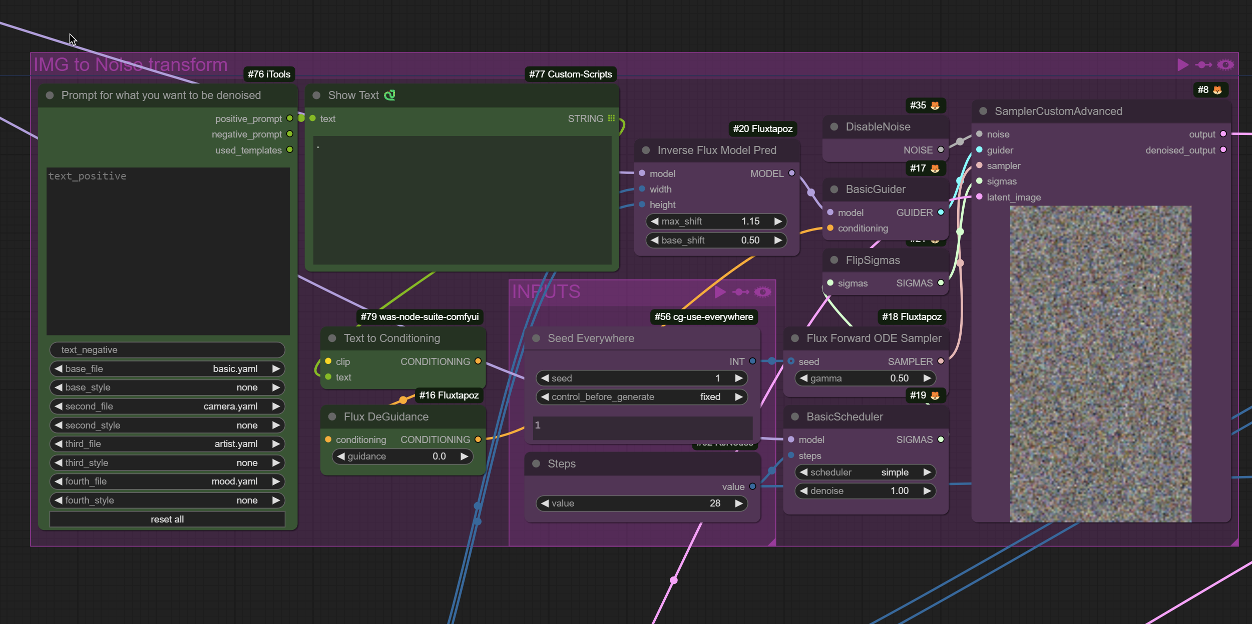 简化来说:想象一个基础的img2img工作流,您发送输入图像 -> 从中生成随机噪声 -> 将其送入采样器以获得输出图像。但在此工作流中,您可以根据设置控制从输入图像生成的噪声类型。例如,您可以仅修改图像的某一部分(图像修复),或转移图像风格(ip-adapter)。