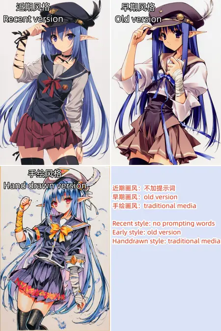 プロンプトに「old version」を使用すると、そのアーティストの初期スタイルの効果を得られます。