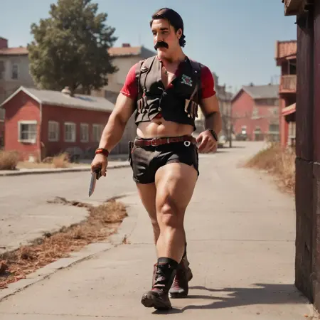 Nahualli, mustache, red shirt, black vest, black trousers, tactical gear,