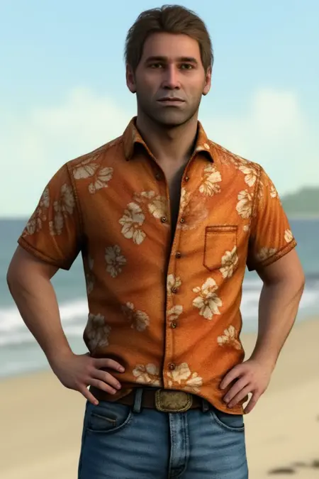 collared shirt, orange shirt, hawaiian shirt, floral print, short sleeves, jeans, blue pants,