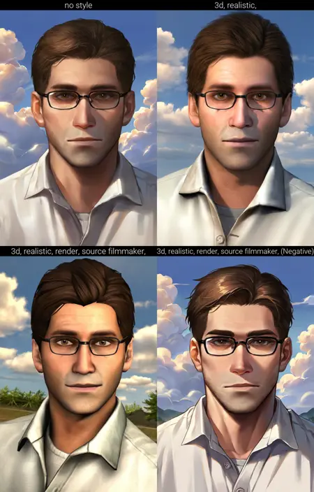 v1.0 - LoRA는 30장의 이미지(스크린샷, 공식 아트, 콘셉트 아트, 팬 아트, 제가 찾을 수 있는 모든 것)로 학습되었습니다. 대부분의 이미지는 3D이지만, 모델은 충분히 유연합니다. 3D 및 2D 모두 생성 가능합니다. 3D를 생성하려면 프롬프트에 **3d, realistic,**를 추가하고, 2D를 생성하려면 네거티브에 **3d, realistic,**를 추가하세요. 더 강력한 3D 효과를 원하면 프롬프트에 **render, source filmmaker,**도 추가하세요.