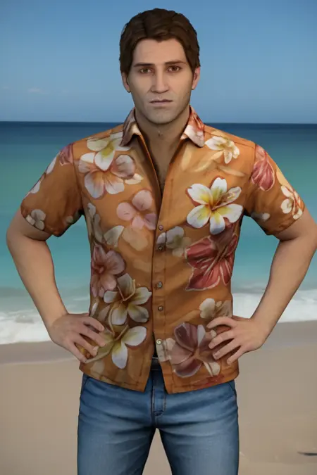 collared shirt, orange shirt, hawaiian shirt, floral print, short sleeves, jeans, blue pants,