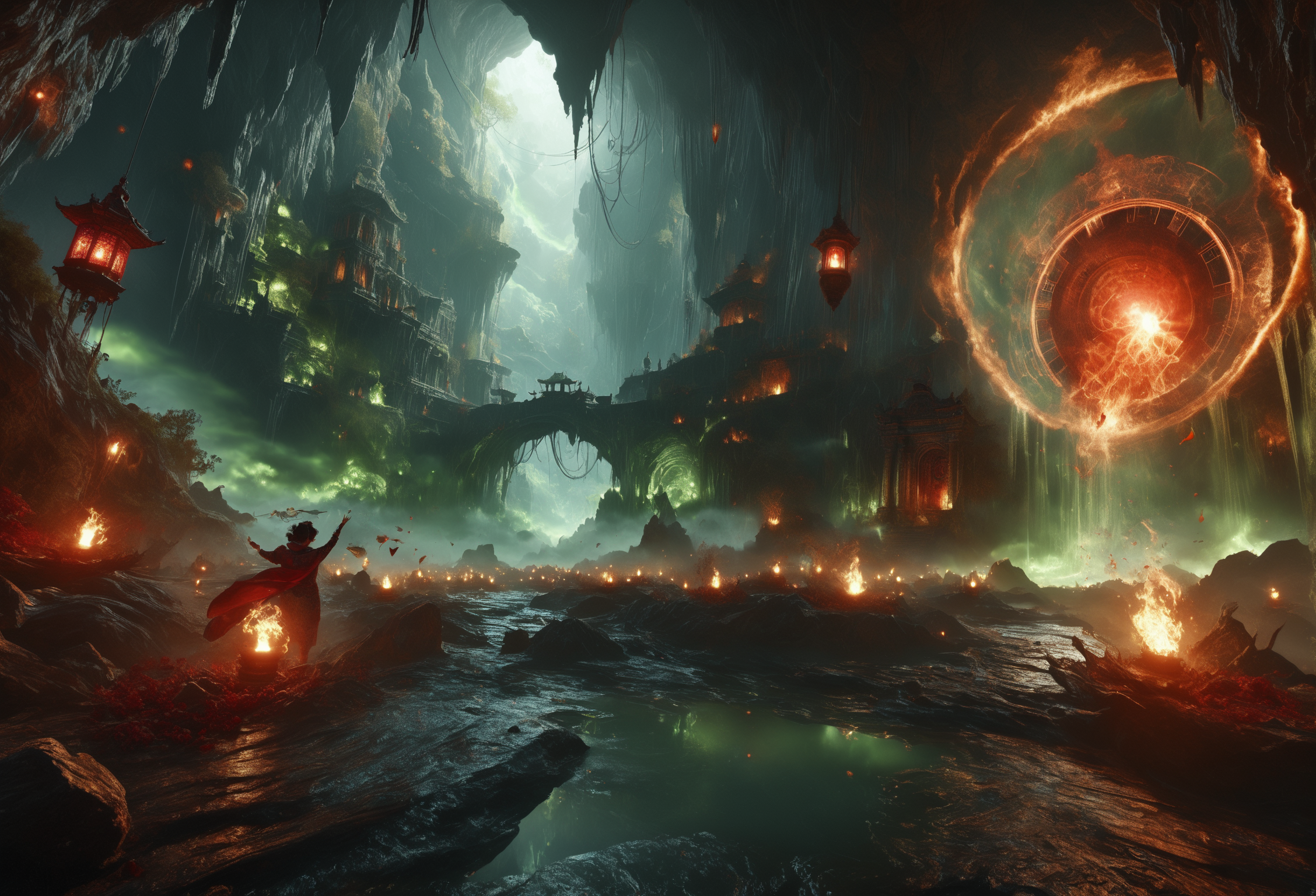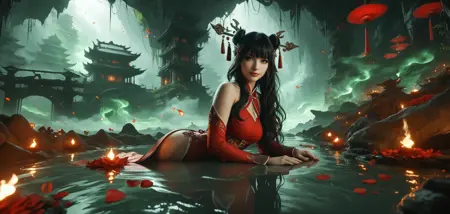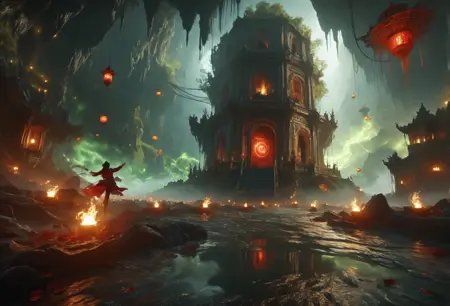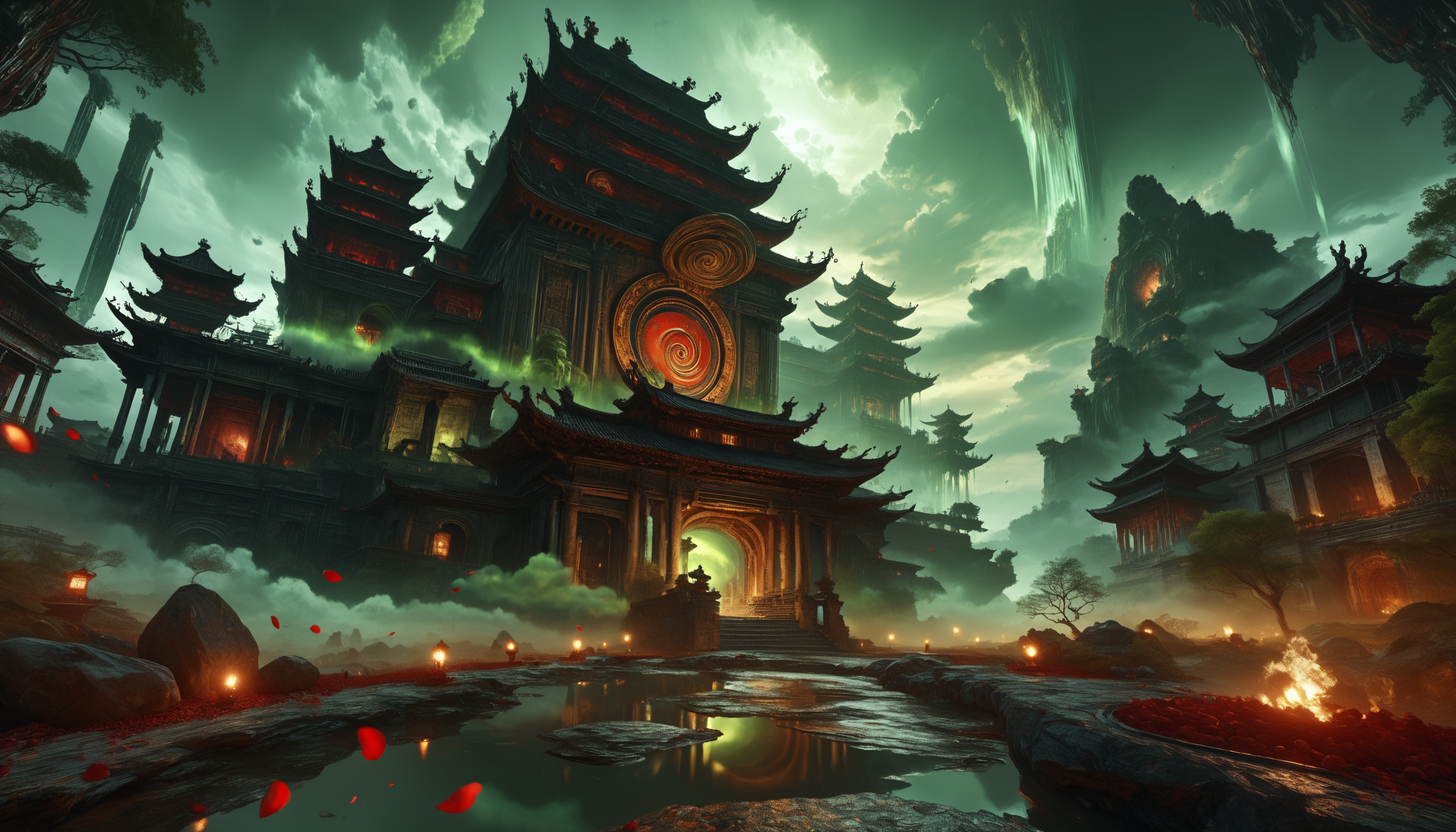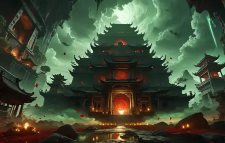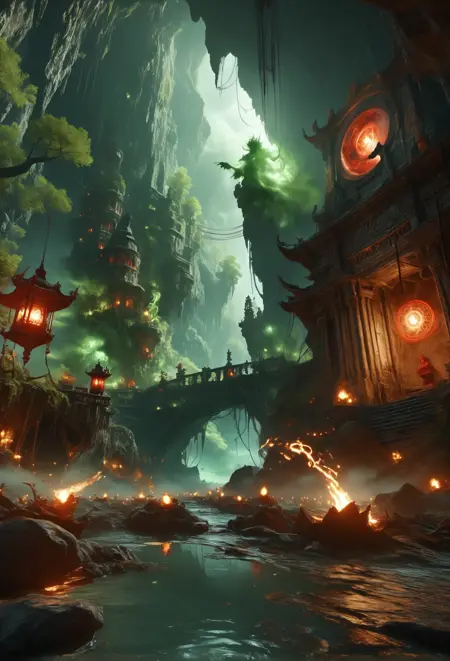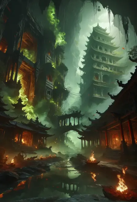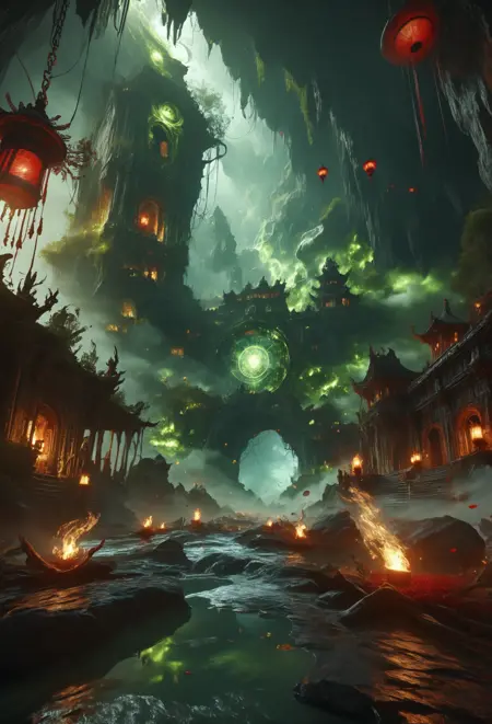 プレビューと同じように荘厳で美しく不気味な風景を生成するには、プロンプトに次のタグをすべて含めてください: "abyssmerald, dark, haunting, green fog, cave, ruins, red lantern, background fantasy, ancient background"