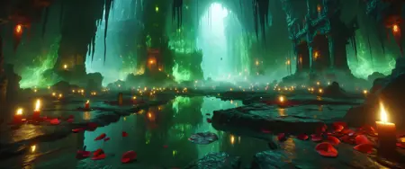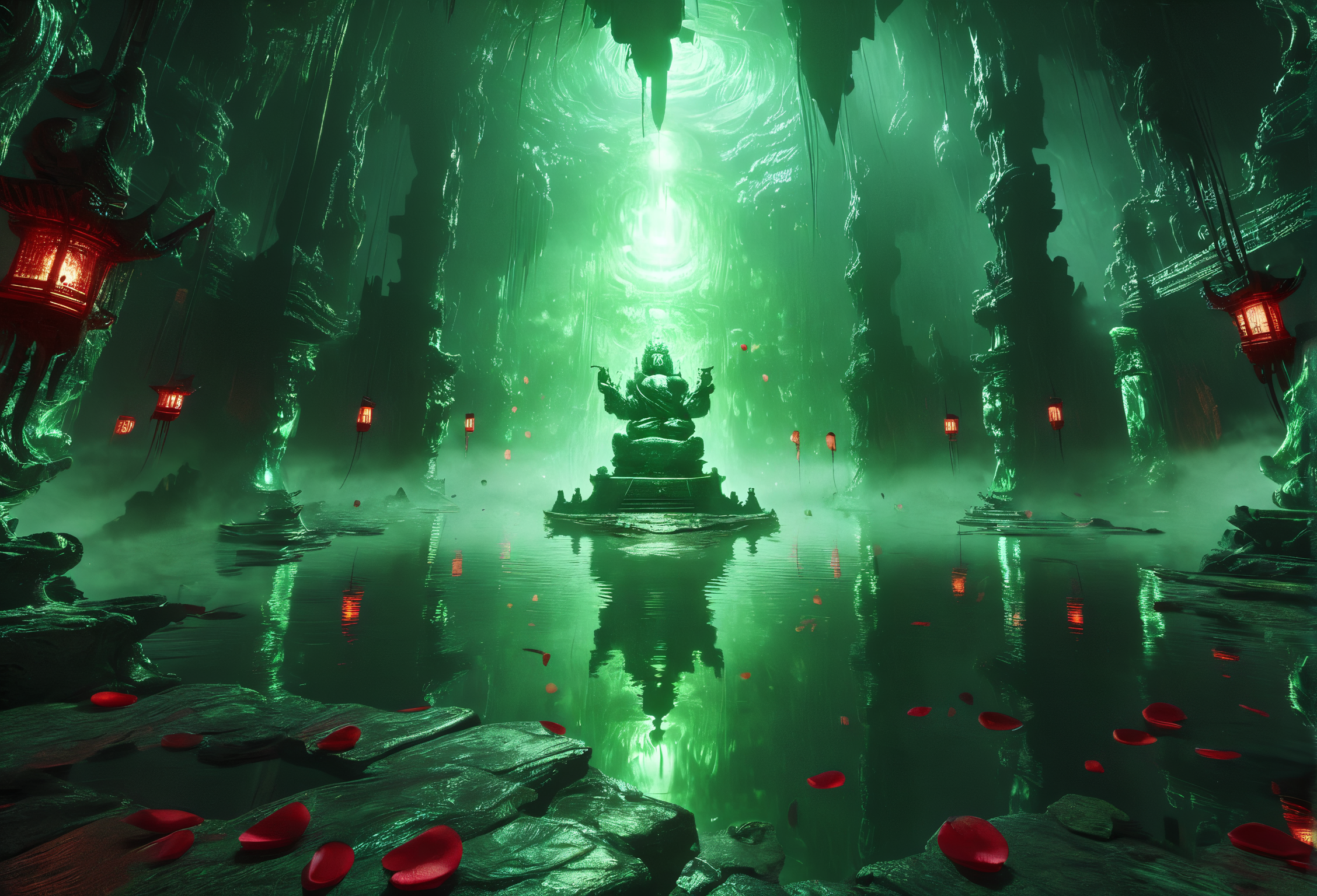 To generate hauntingly beautiful scenery similar to the preview, you should use all these tags in your prompt: "abyssmerald, dark, haunting, green fog, cave, ruins, red lantern, background fantasy, ancient background"