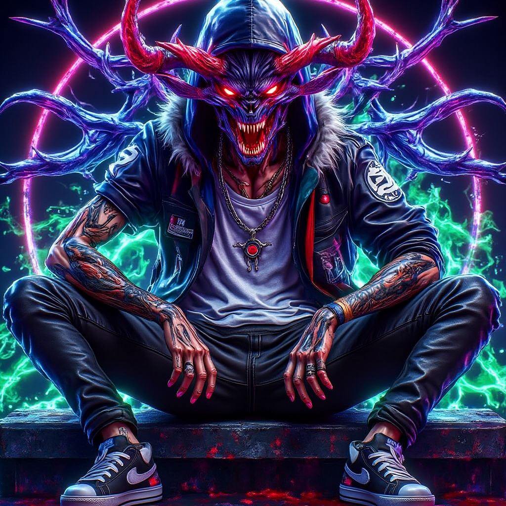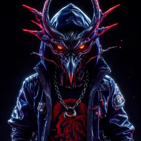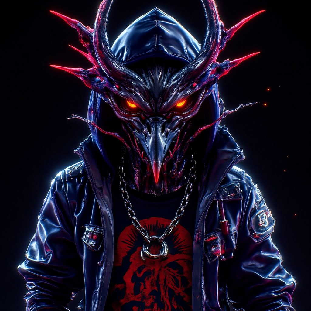 ネオンホラー効果: 輝くネオンイエローとグリーンがこの美意識の中心であり、目、口、武器から発せられ、怪物的でバイオホラー的な外観を生み出します。鋭くギザギザした笑みや不気味に輝く顔の特徴は、恐ろしく、まるで自意識を持つ機械のような印象を与えます。