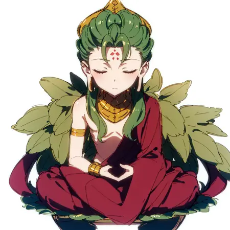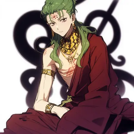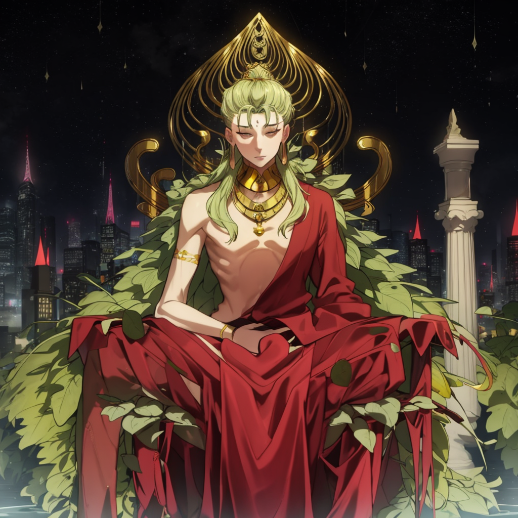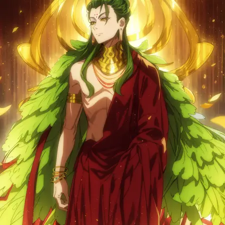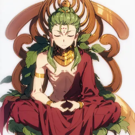 正面:Buddha, 1boy, male focus, solo, green hair, yellow eyes, long hair, jewelry, earrings, standing, cowboy shot, lora:0.8,