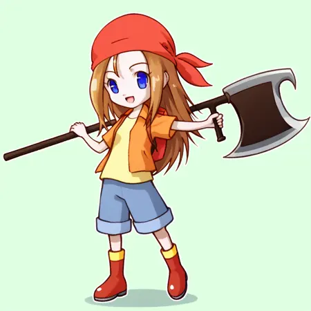 服装:黄色衬衫、橙色外套、牛仔短裤、红色靴子、背包