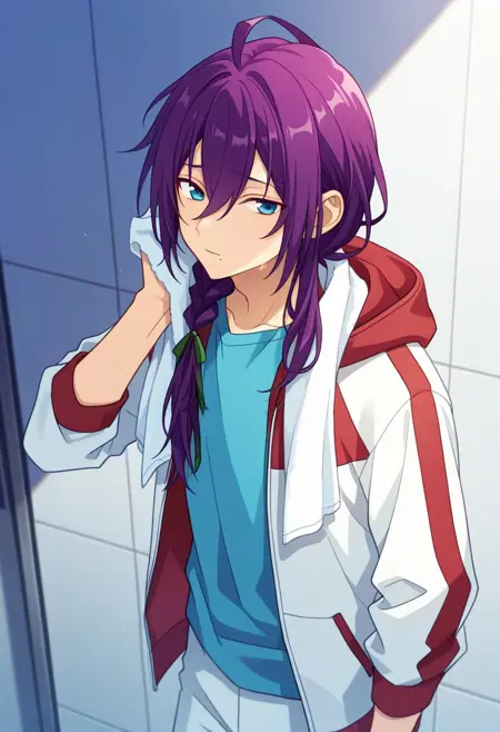 마요이, 1소년, 남성 중심, 단독, 보라색 머리, 땋은 머리, 단일 땋은 머리, 긴 머리, 아호게, 눈 사이 머리, 어깨 위 머리, 리본, 머리 리본, 파란 눈, 점, 입 아래 점, 재킷, 트랙 재킷, 후드, 열린 재킷, 열린 옷, 셔츠, 파란 셔츠, 바지, 흰 바지,