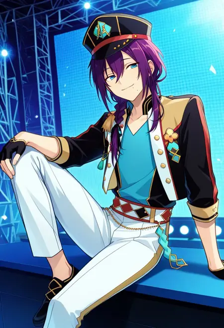 mayoi, 1boy, 男性焦点, 单人, 紫色头发, 发辫, 单条发辫, 长发, 天线发, 发丝遮眼, 发丝垂肩, 丝带, 头发丝带, 蓝色眼睛, 雀斑, 嘴下雀斑, Alkaloid制服, 帽子, 尖顶帽, 夹克, 黑色夹克, 短款夹克, 开襟夹克, 开放式服装, 衬衫, 黑色衬衫, 蓝色衬衫, 多色衬衫, 腰带, 裤子, 白色裤子, 手套, 黑色手套, 无指手套, 鞋子, 黑色鞋履,