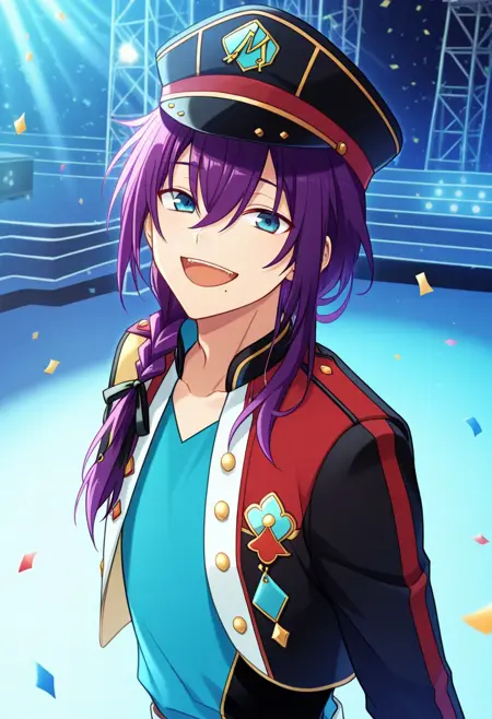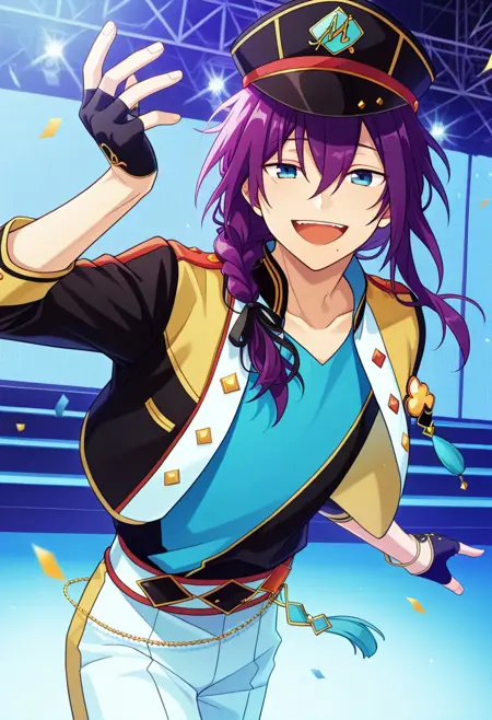 마요이, 1소년, 남성 중심, 단독, 보라색 머리, 땋은 머리, 단일 땋은 머리, 긴 머리, 아호게, 눈 사이 머리, 어깨 위 머리, 리본, 머리 리본, 파란 눈, 점, 입 아래 점, 알카로이드 유니폼, 모자, 뾰족한 모자, 재킷, 검정 재킷, 짧은 재킷, 열린 재킷, 열린 옷, 셔츠, 검정 셔츠, 파란 셔츠, 다색 셔츠, 벨트, 바지, 흰 바지, 장갑, 검정 장갑, 손가락 없는 장갑, 신발, 검정 신발,