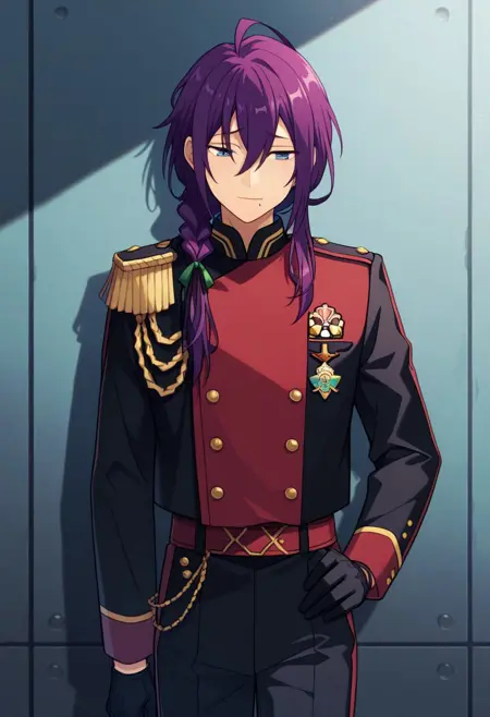 마요이, 1소년, 남성 중심, 단독, 보라색 머리, 땋은 머리, 단일 땋은 머리, 긴 머리, 아호게, 눈 사이 머리, 어깨 위 머리, 리본, 머리 리본, 파란 눈, 점, 입 아래 점, 유니폼, 군사, 군사 유니폼, 장갑, 검정 장갑, 재킷, 검정 재킷, 빨간 재킷, 긴 소매, 아기유LETTE, 어깨장식, 더블버튼, 단추, 바지, 검정 바지,