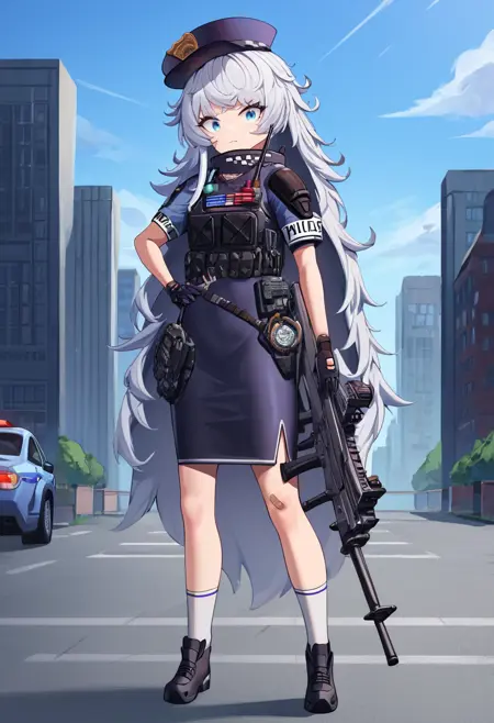 デフォルトの肌: zpoliorigin, 1girl, zpolia_outfit, 長い髪, 前髪, 青い目, スカート, 手袋, 帽子, 非常に長い髪, 白い髪, 短めの袖, 靴, 黒い手袋, ソックス, 黒いスカート, 黒い靴, 白いソックス, バンデージ, ハンドガン, ペンシルスカート, 警察, 足にバンデージ, 警察官の制服, 膝にバンデージ, 女性警察官, 持ち運び用の武器, ラジオ