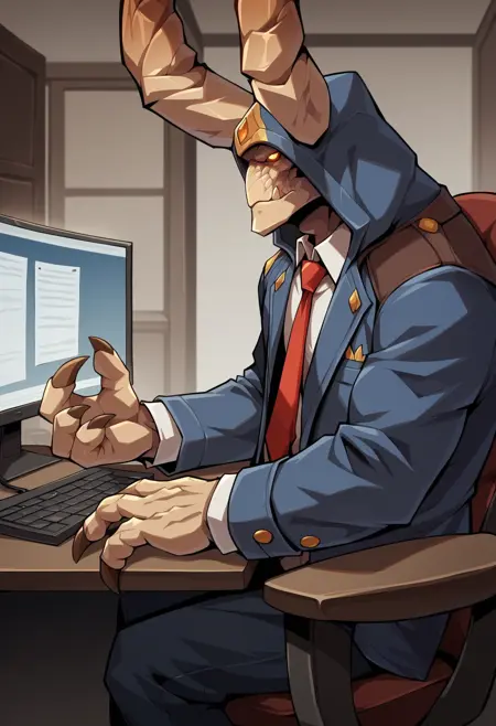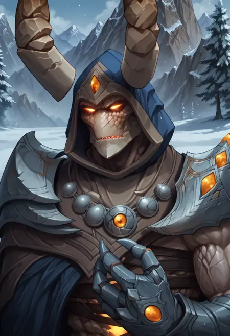 트리거 단어: iridikron, monster, rock body, horns, hood, glowing eyes