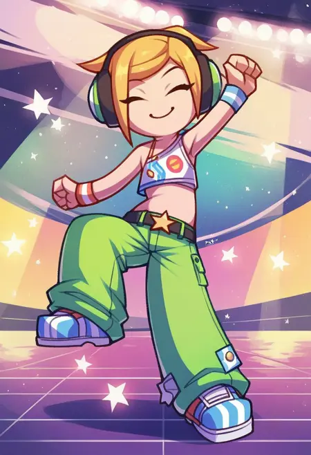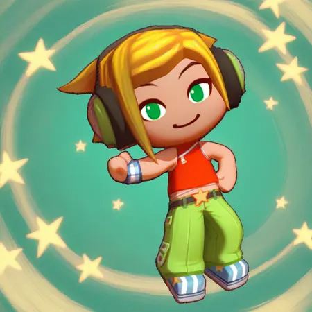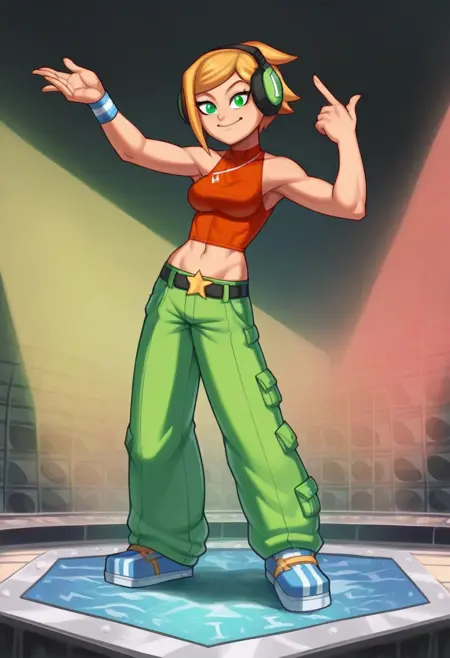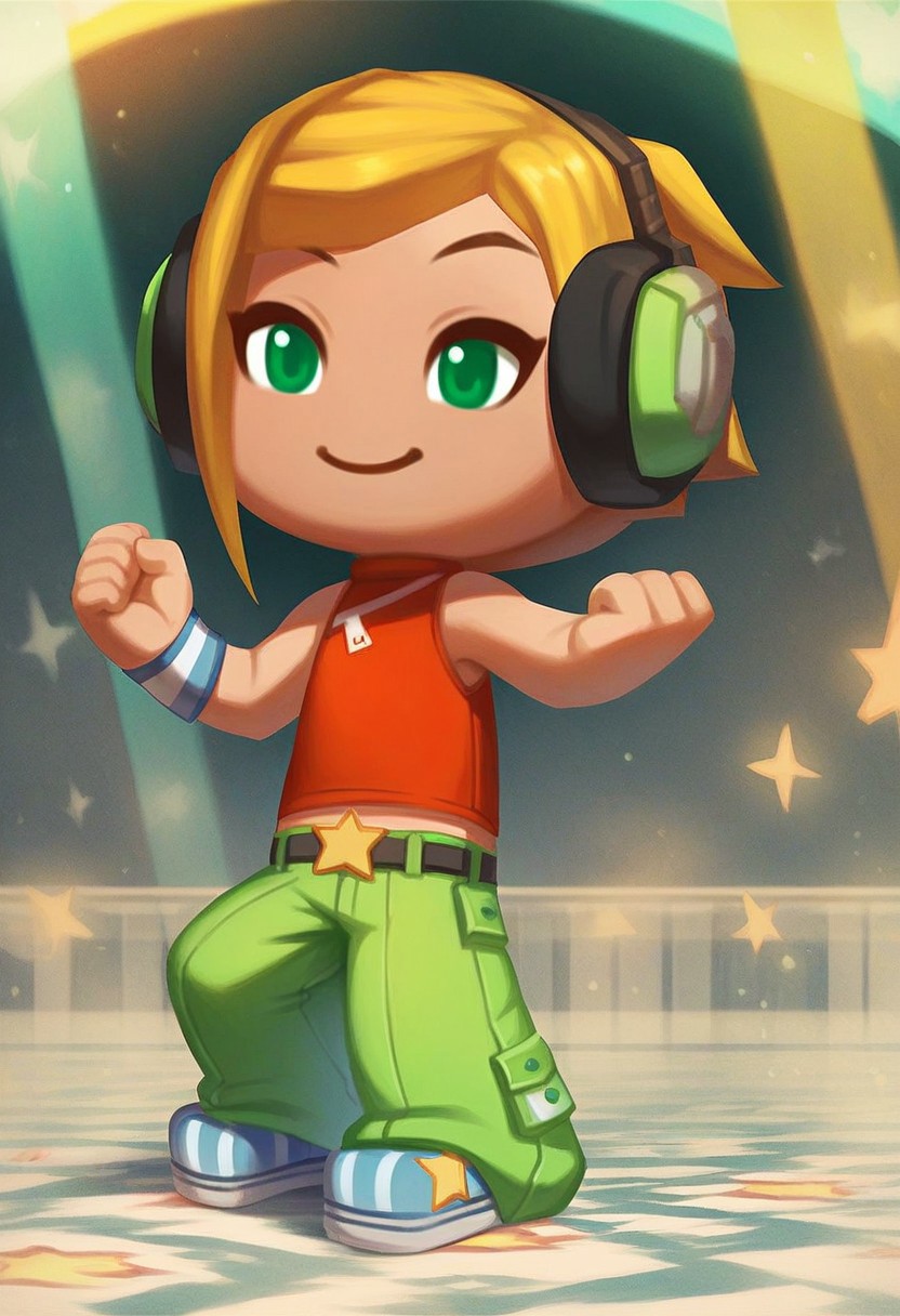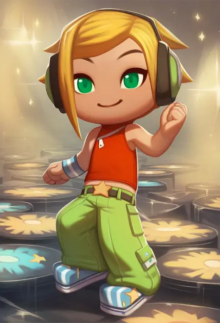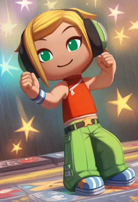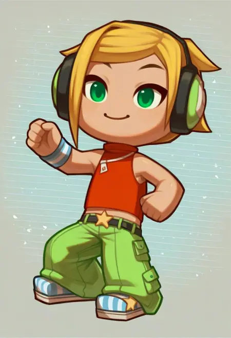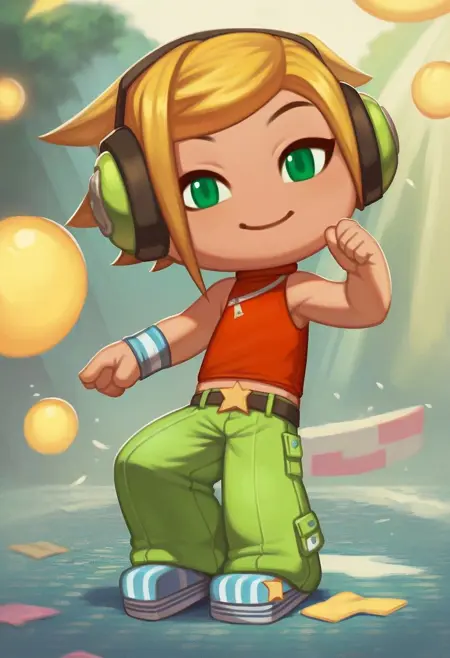 Tags are: "DJCandy_MySims, short blonde hair, green eyes, headphones, sleeveless red top, baggy green pants, belt, striped footwear, wristband". As with all my MySims models, add "Chibi" if you want her in-game form, and adding "adult" to the positive prompt and "child" to the negative may help things to look right.