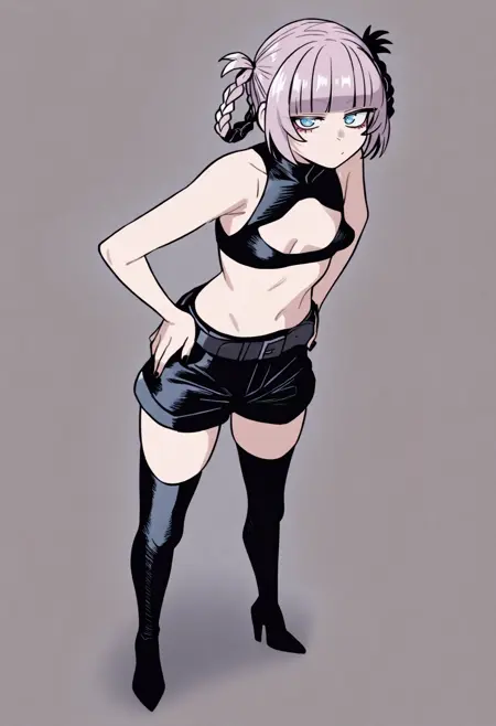 衣装プロンプト:belt, black shorts, cleavage cutout, sleeveless turtleneck, crop top, thighhighs, black thigh boots, high heel boots